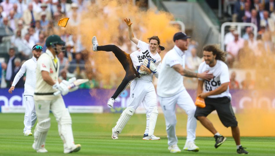 Silly man off: Just Stop Oil activists disrupt Ashes Test at Lord’s – before England wicketkeeper carries protester from the pitch